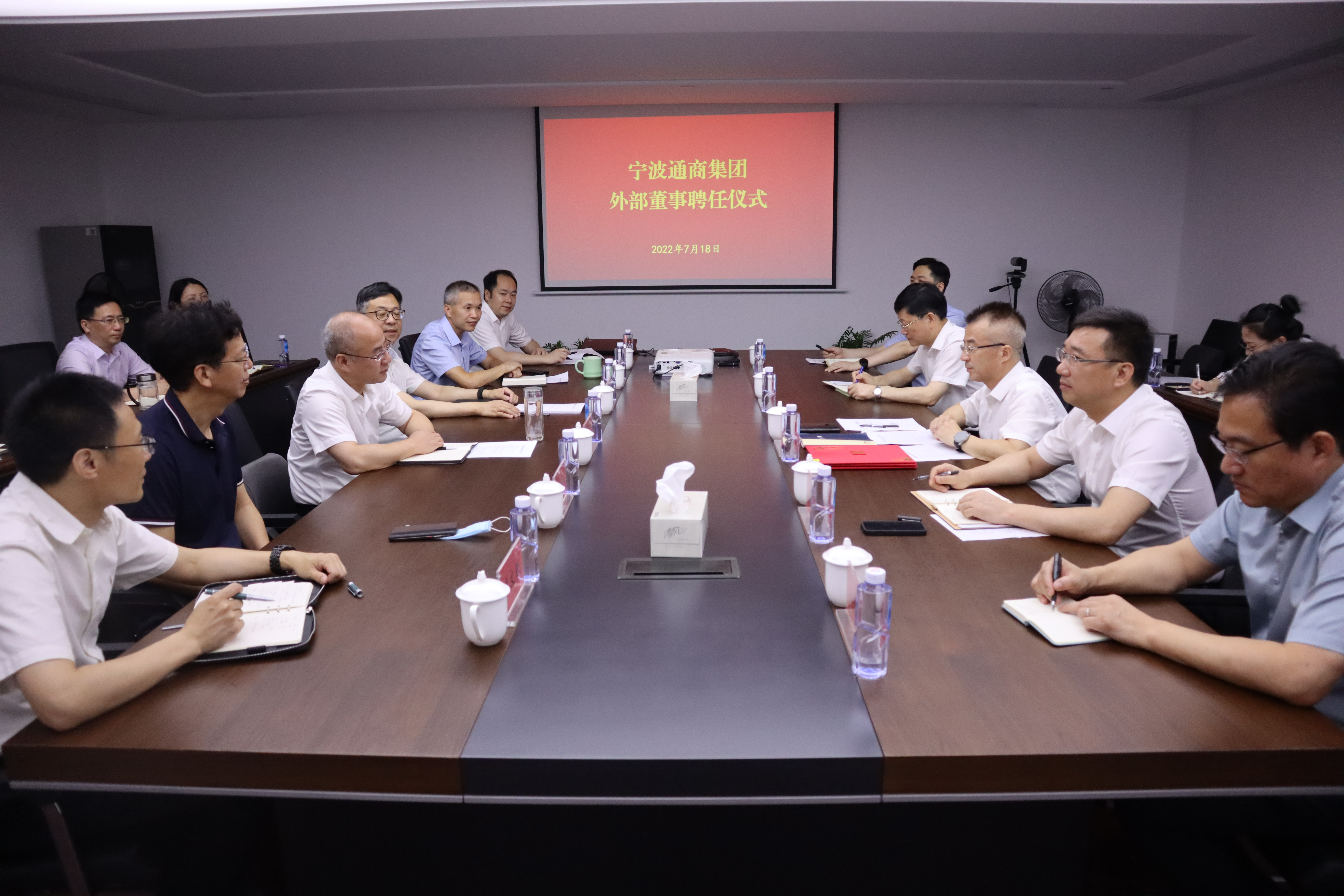 • 7月18日,宁波通商集团举行外部董事聘任仪式。市国资委党委副书记、副主任沈恩东为3位新任外部董事颁发聘书并讲话。集团党委书记、董事长宋达军和新任外部董事作了表态发言。集团领导班子、外部董事、市国资委相关处室、市国资委专职监事、集团各部门相关负责人参加会议。